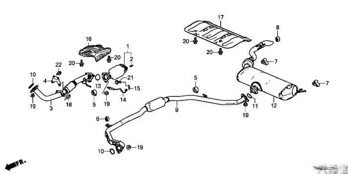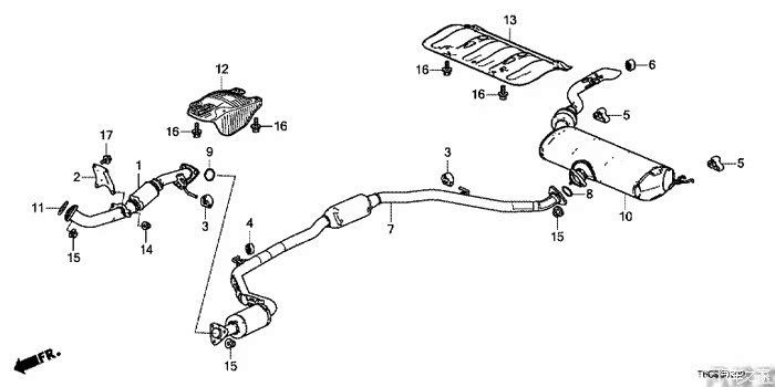 这是汽油版奥德赛的排气结构图,可以看到数字1 2这边是一个可以独立拆下来的副三元,只要定制一根直通管就能提高流量。用不了3000元就能换一个双边单出的尾段,已经有别人的车友换过了,据说排气更通畅。我为了营运不增加噪音,优先考虑中段与头段改善。