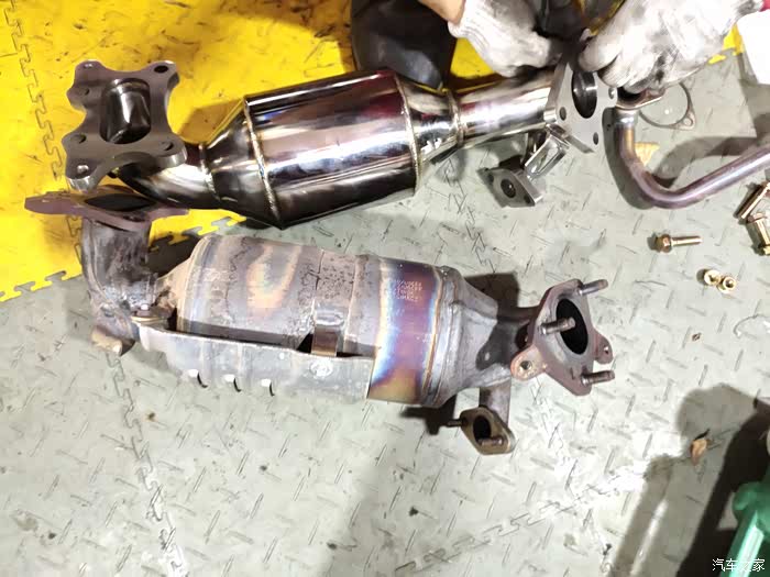 拆下原厂头段不难发现,粗壮的部分明显比改装件要长很多。西瓜视频中的HONDA老刘管本田的国6催化叫四元催化,从变色位置来看估计是2-3段不同材质催化拼起来的。最近又看了老刘的视频说所谓四元催化是把颗粒捕捉器整合到了头段里。对于烧机油的车来说颗粒捕捉器很容易堵,本田自吸或可以高枕无忧了。隔壁德系车不少相关视频都在讨论GPF(颗粒捕捉器)再生和更换的问题。