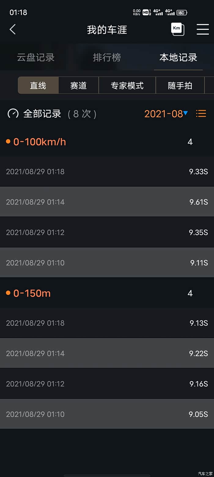 我先后做了4次测试,S档关闭防滑。第三次测试有点急促所以没有踩着刹车踩油门弹射起步,成绩稍差。