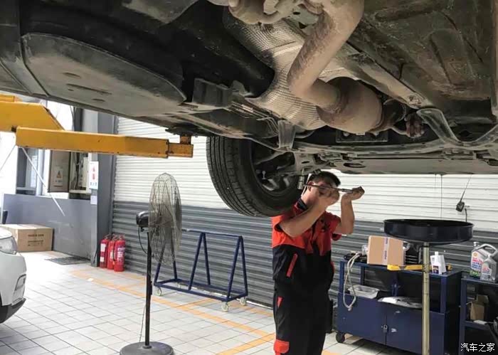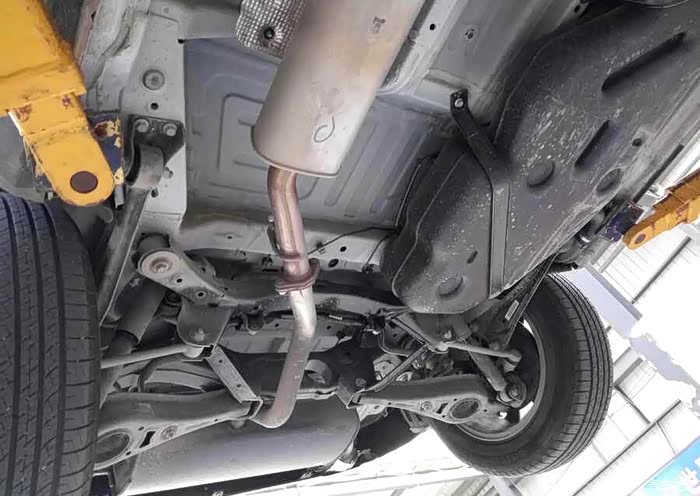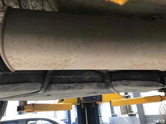 技术小哥正在检查轮胎半轴那些,我突然发现我的排气管消音包有点锈斑 。