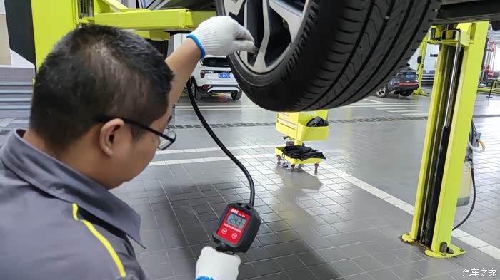 工作人员正在给做夏季关爱项目的检测,给车做胎压监测。
