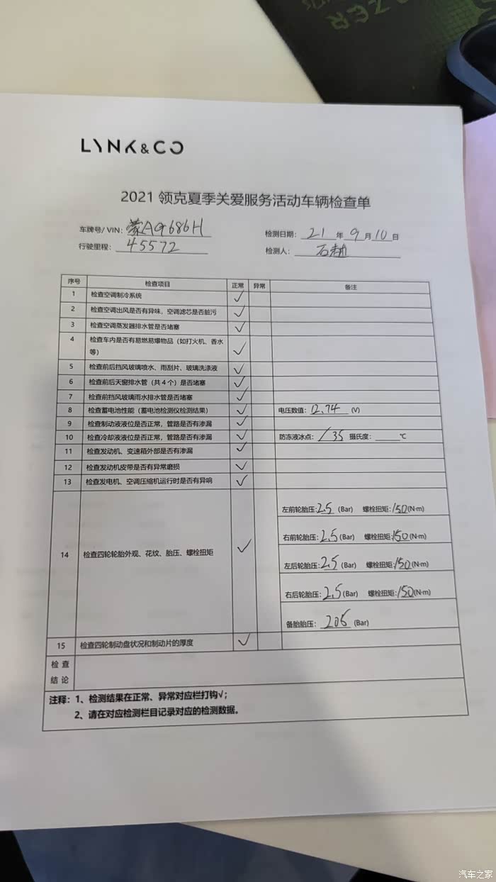 售后服务顾问告知我,第五次保养主要保养项目就是基础的更换机油机滤,空气滤芯,空调滤芯。然后赶上现在领克有个夏季客户关怀的活动,给做了15项的安全检查。