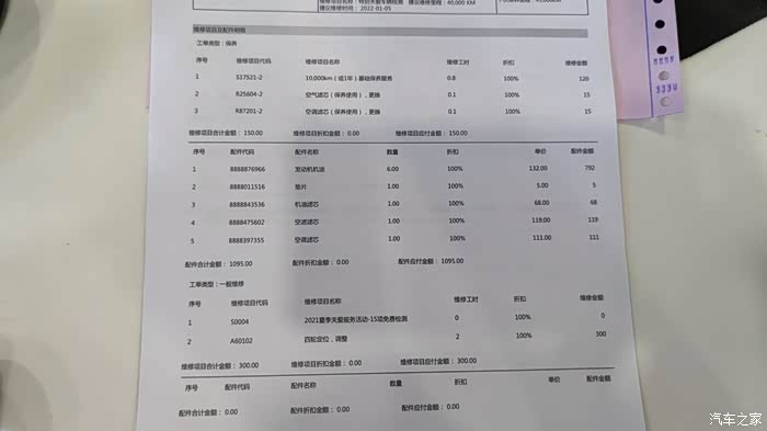 价格单也出来了,6瓶机油792元,垫片5元,机油滤芯68元,空滤滤芯119元,空调滤芯111元,保养价格1095元。然后工时费共150元。因为我感觉车有点跑偏,又做了个四轮定位300元。最后总计1095+150+300=1545元。