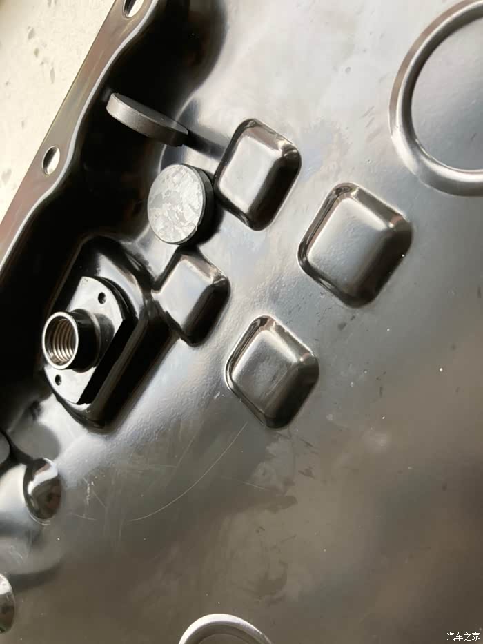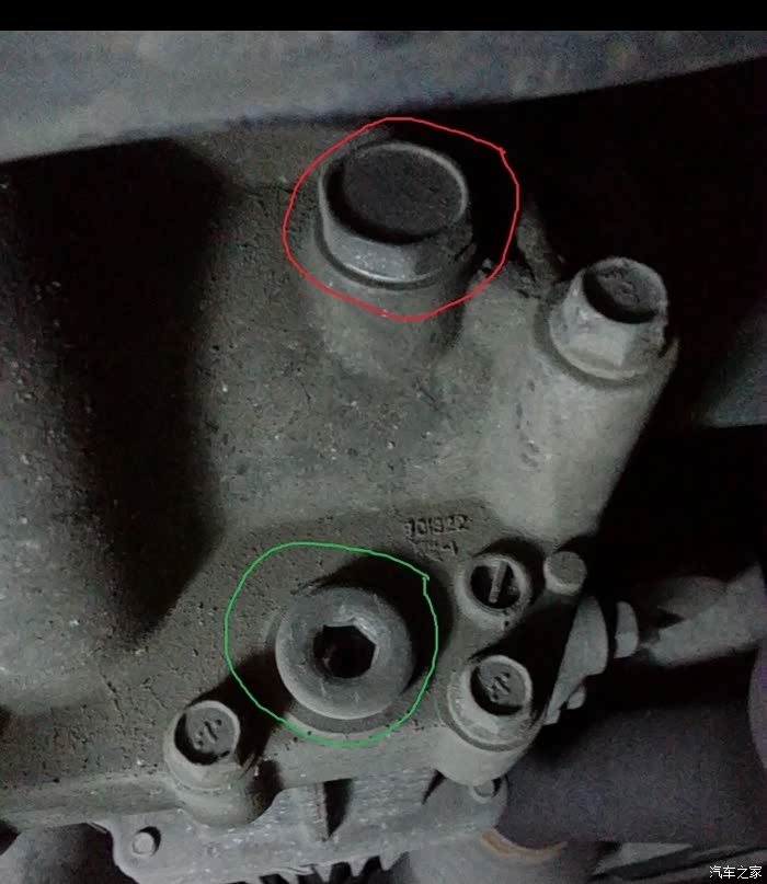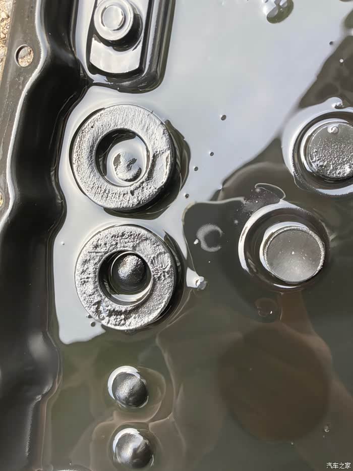 这里重点说一下给以后想自己动手换油的车友提个醒。画红色的是加油螺丝,蓝色放油螺丝拆下来很脏,上面吸了很多油泥杂质。