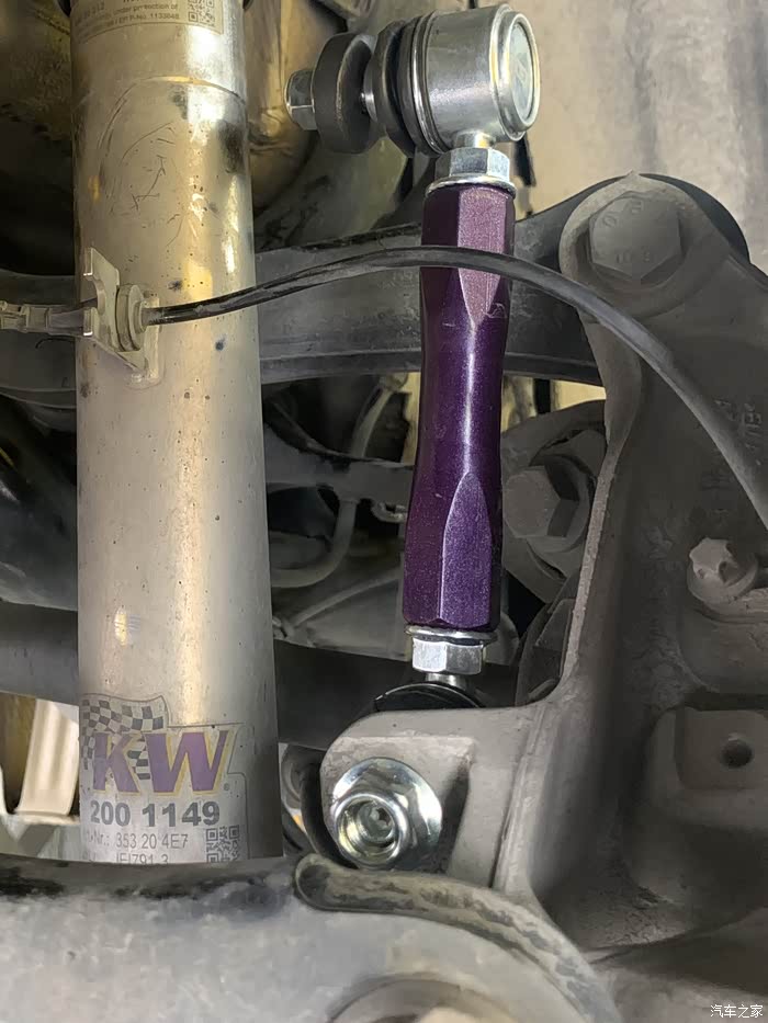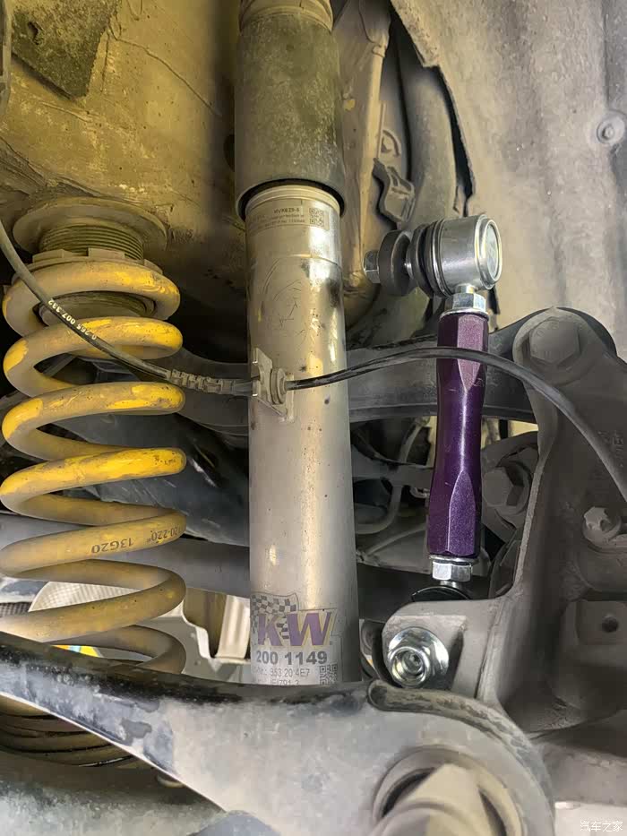 关于底盘改装,避震也是提升操控最大的收益,占底盆稳定性的70%以上,换了一套避震等于换了一台车的感觉。因为考虑平时跑街道比较多,所以选择了KW-V3避震。还没有加底盘件之前V3数据是前7,6后10,8(个人观点)安装全车底盘件后避震还需要再调整下。