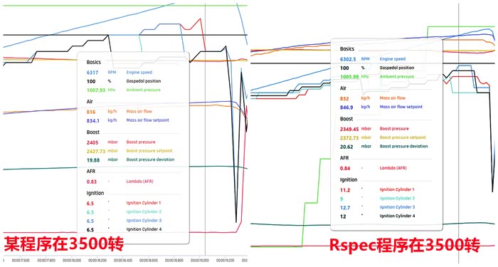 Rspec只用低涡轮增压对比某程序高涡轮增压状态下:更平顺,温度更低,扭力更强,马力更强,油温控制得更好,更安全,效率更高。