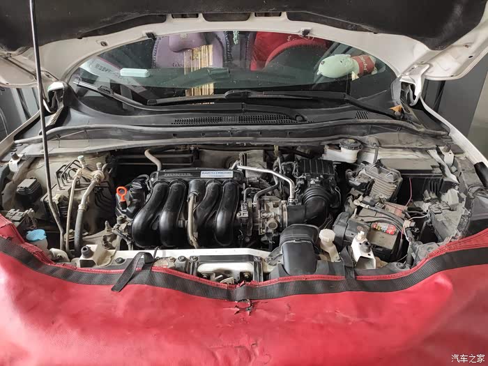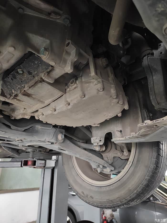 拆开发动机防护板,看到了发动机还有变速箱等一些部件。