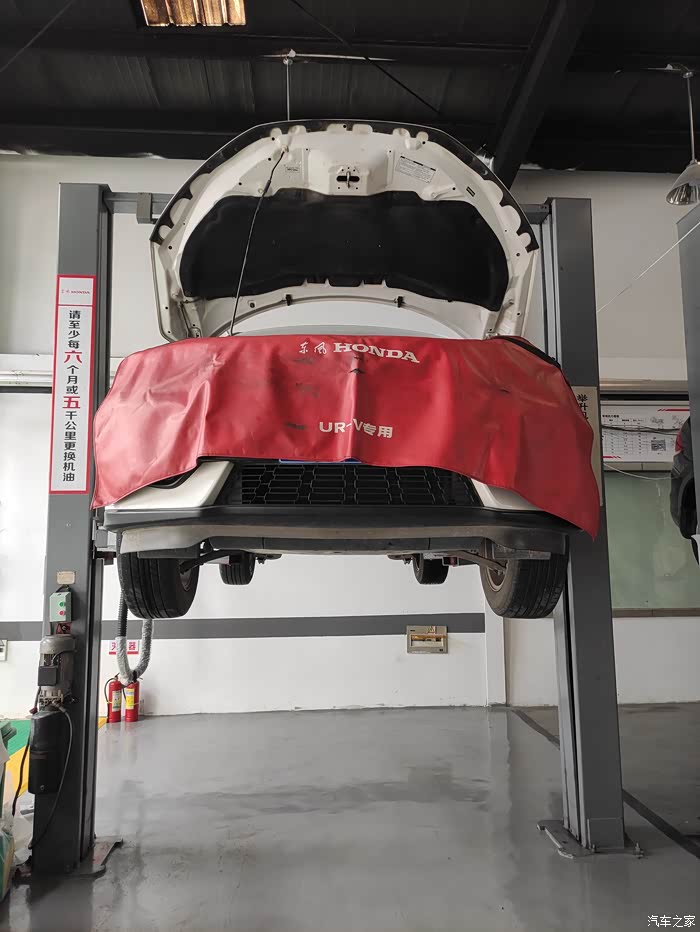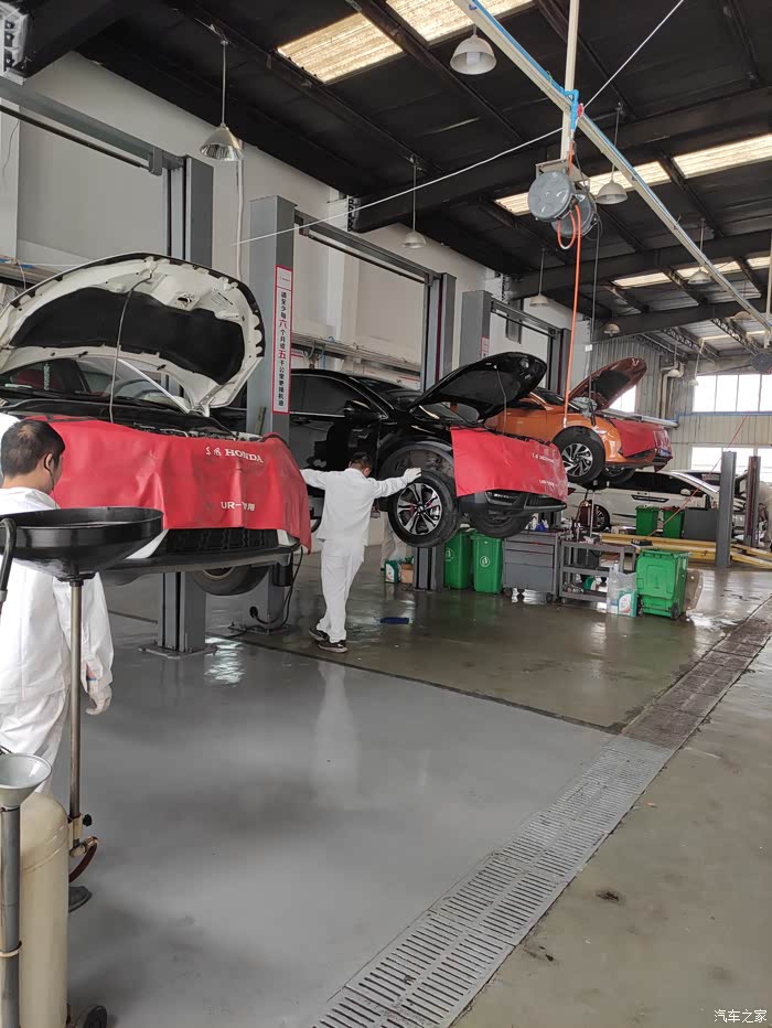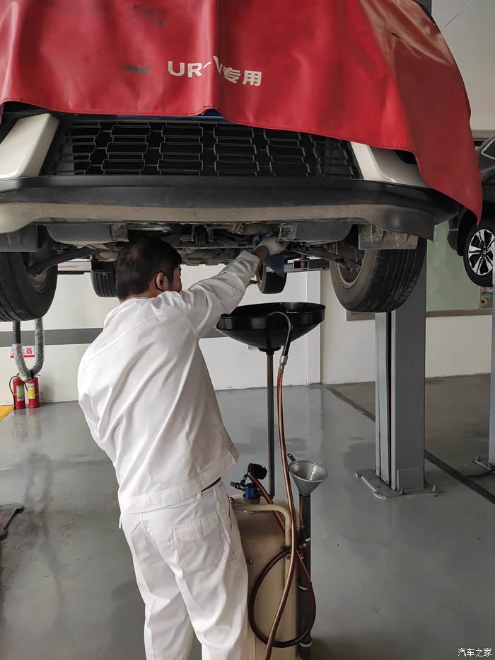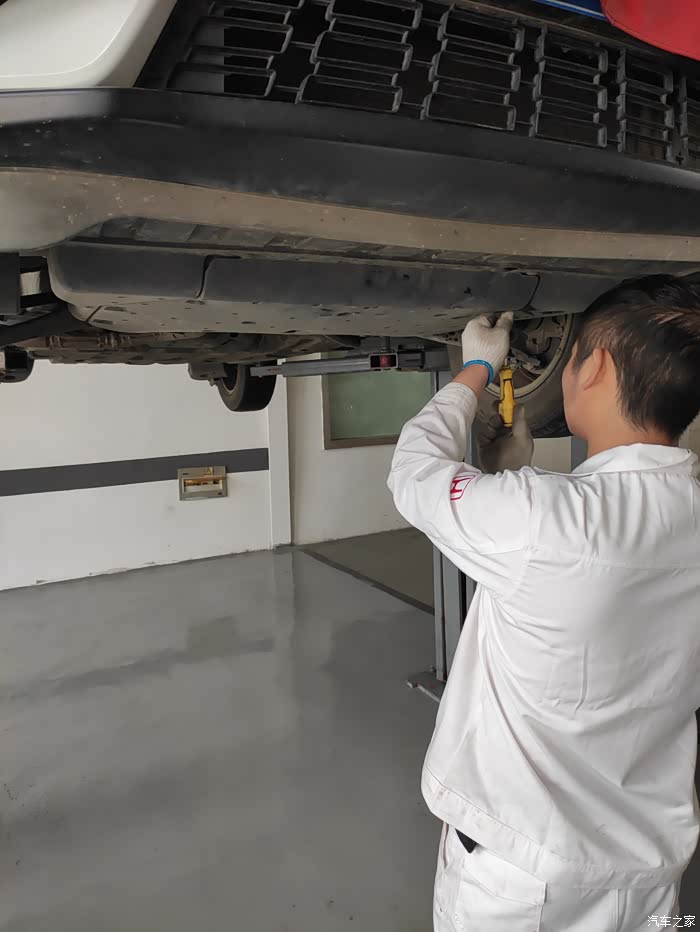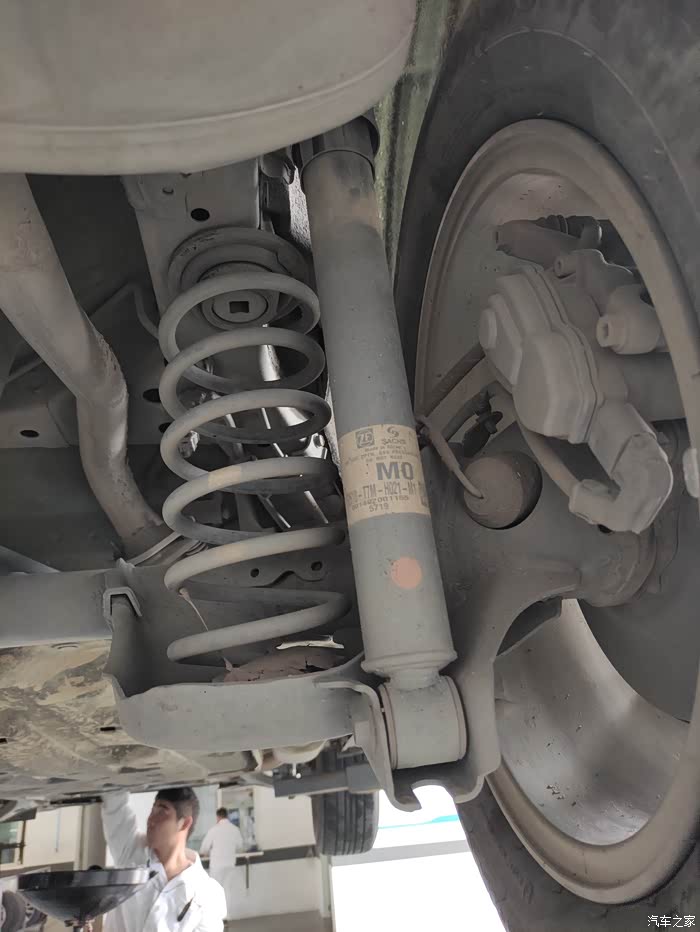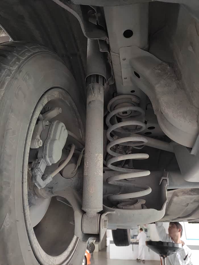 技师趁着放变速箱油的功夫检查一下车辆的减震和刹车系统