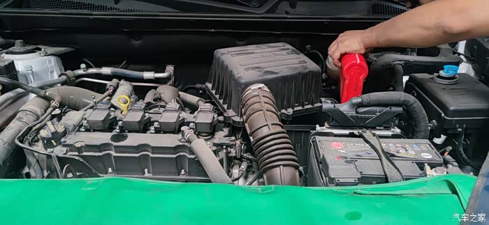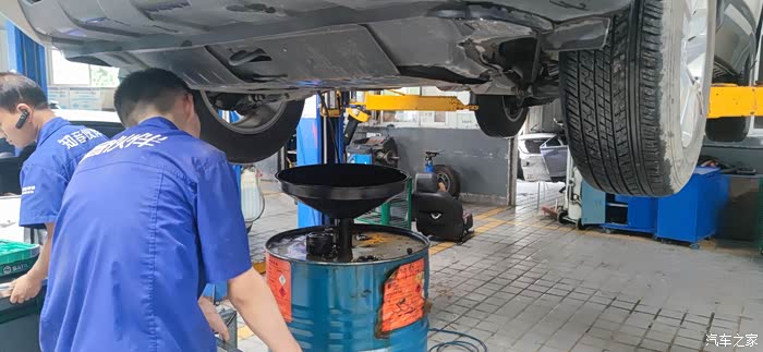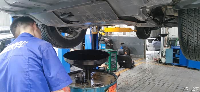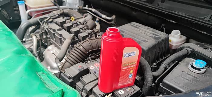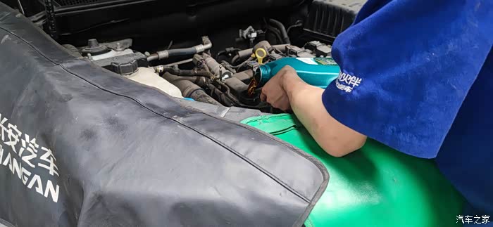车间从举重机放下来,就可以开始加机油了,由于我平时开的比较少,我就使用的是长安厂家赠送的免费机油和机油格,整体来说这种机油还是挺不错的,毕竟是长安汽车原厂的机油。