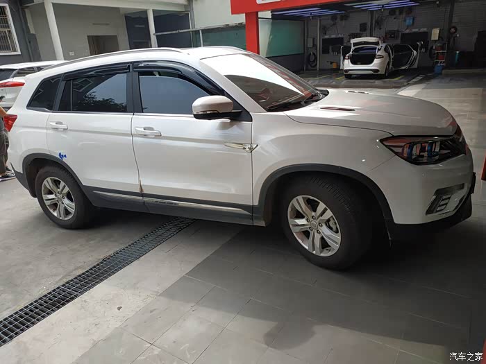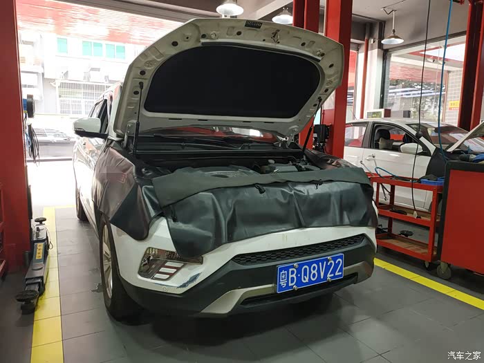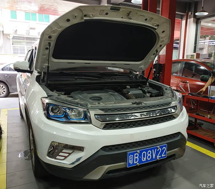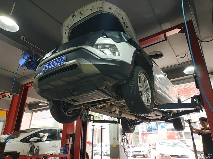 半个小时的等待后,终于轮到我家CS75上场开始做保养了,这是进入了保养工位了。