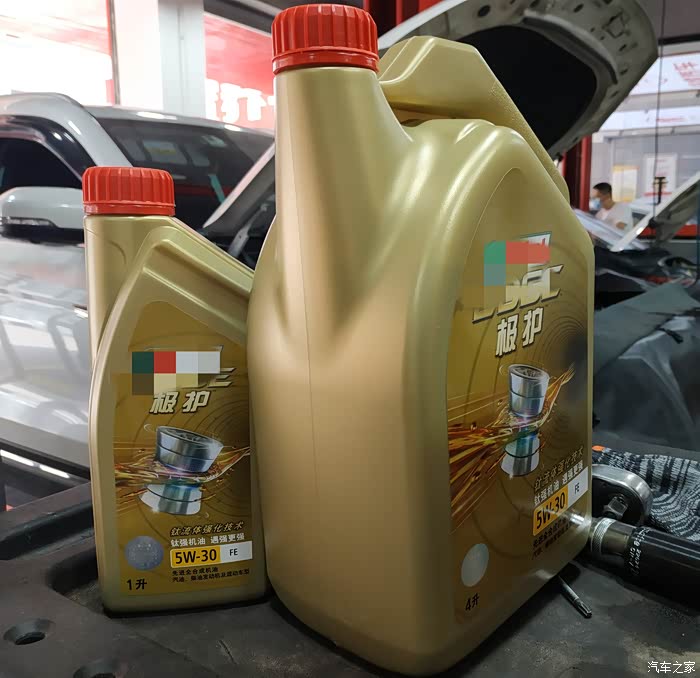 这是今天要更换的机油,为避免广告嫌疑,品牌已经打码,反正用的是相对比较高级的5W-30机油, 总需要4.5升。这儿是定了5升的量。