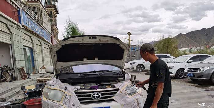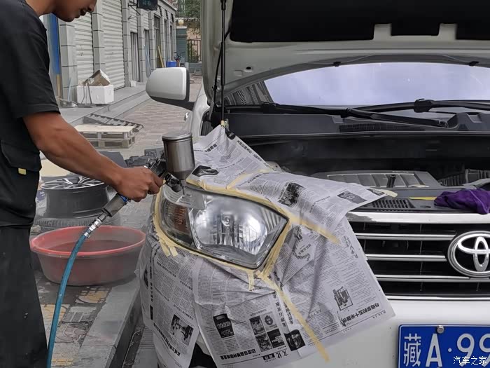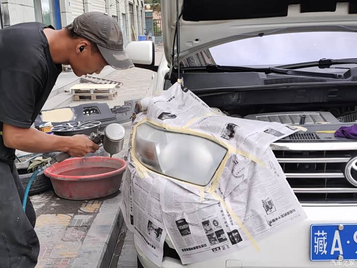 2011的3.5排量老车了,车灯外面那层膜已经被岁月和西藏高原紫外线摧残的很模糊了。有一个朋友是专做汽车工作台,座椅,轮毂翻新的大灯也可以搞。我就过去修一下。其实万能的马家有卖的,那个自己干怕把大灯喷不好,流花了难看。今天去翻新了一下大灯。