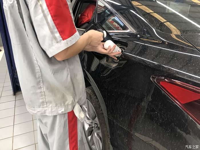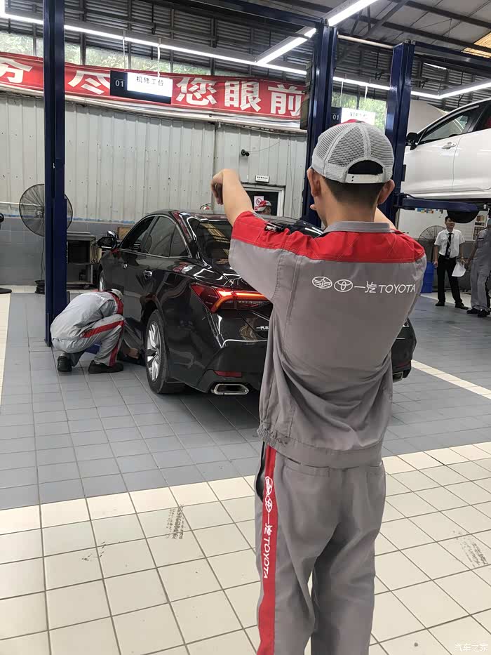 整套流程做完之后,在前挡玻璃贴上了下次保养时间和保养里程的提示贴。把亚洲龙开去洗车区。洗车师傅对亚洲龙进行车辆清洁。当天洗车的车辆还挺多的,但工作人员2个人一起分开合作,速度还算快,就是洗的不够精致,不过也可以理解!