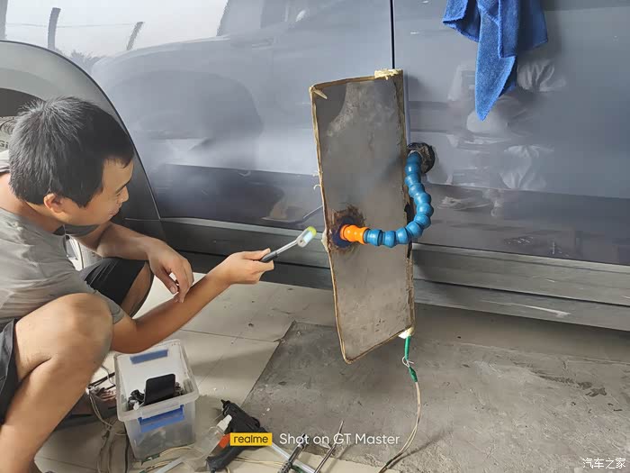 开始准备,原来,这种大坑容易修复,使用热熔胶粘住,然后用工具直接把坑拽回原位,可以看出,第一次用力后,大坑已消失