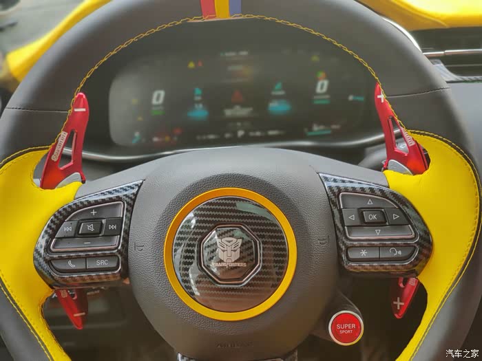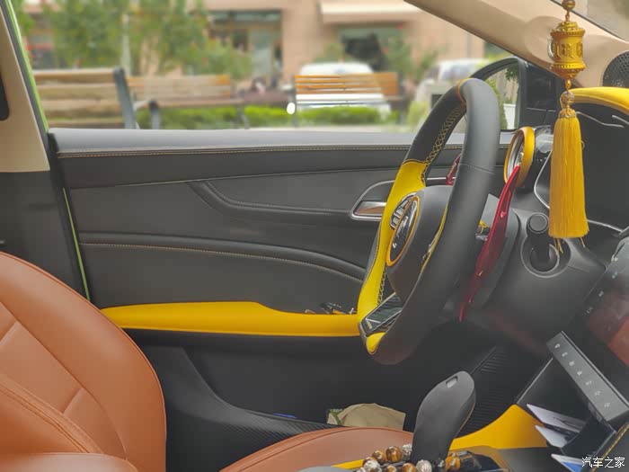 内饰呢,原厂本身就带黄色的装饰,经过我的改装,又更加明显了。方向盘我也是重新包了翻毛皮,380。