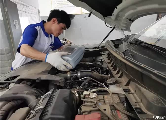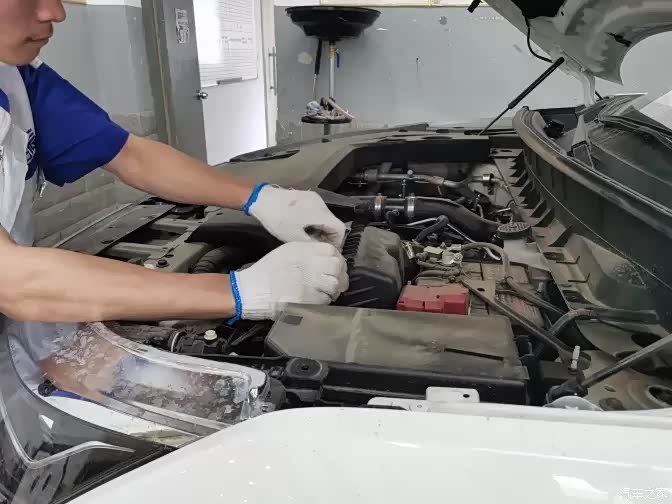 师傅需要先拆掉发动机舱的盖板,才能看到机舱内部,然后找到空气滤芯的位置,更换掉它