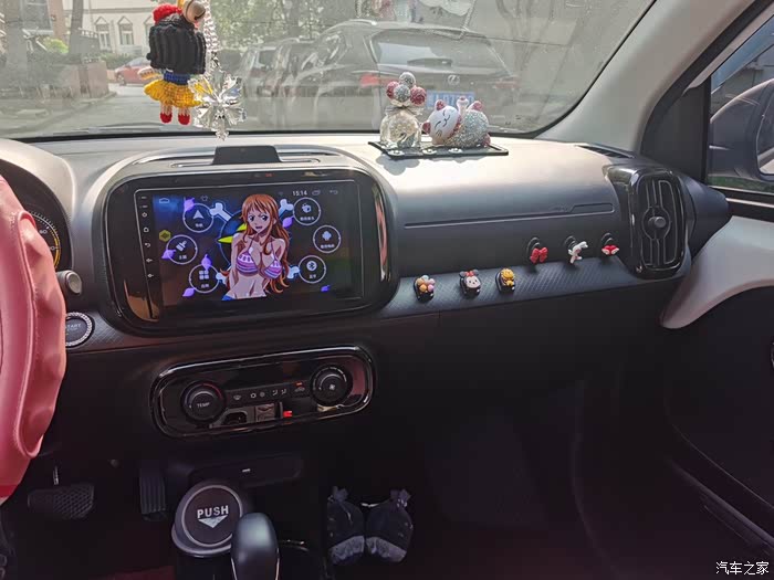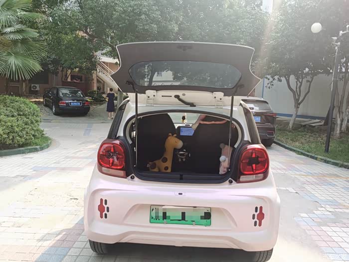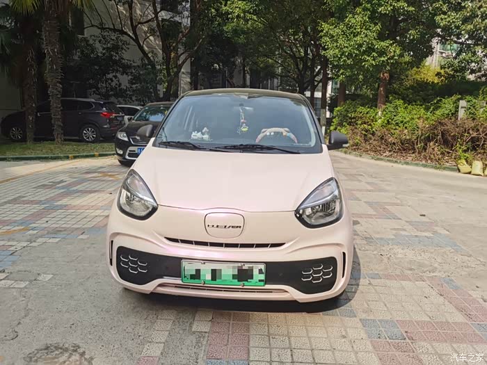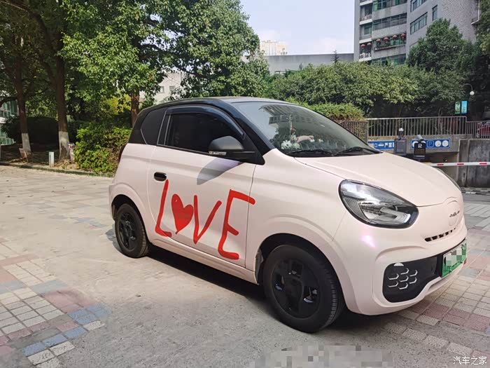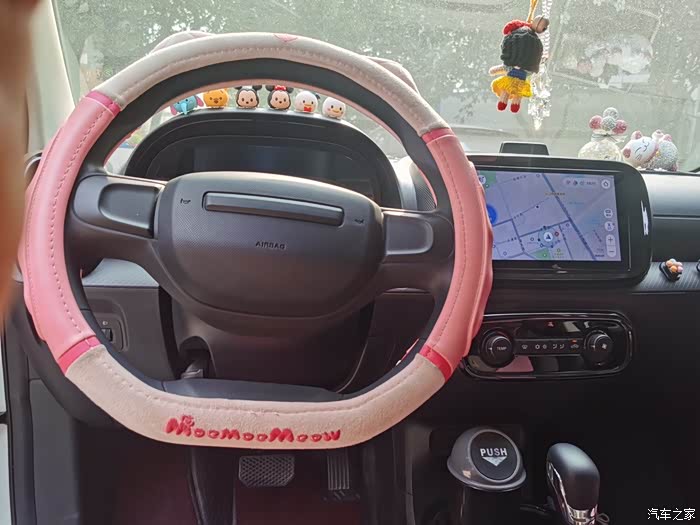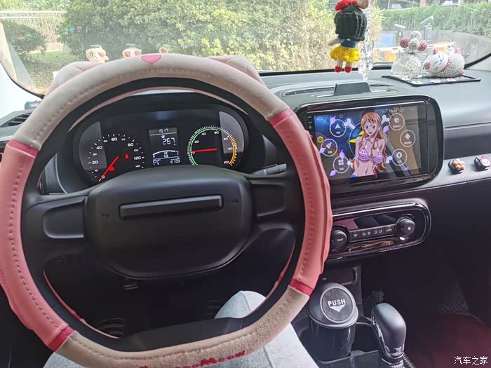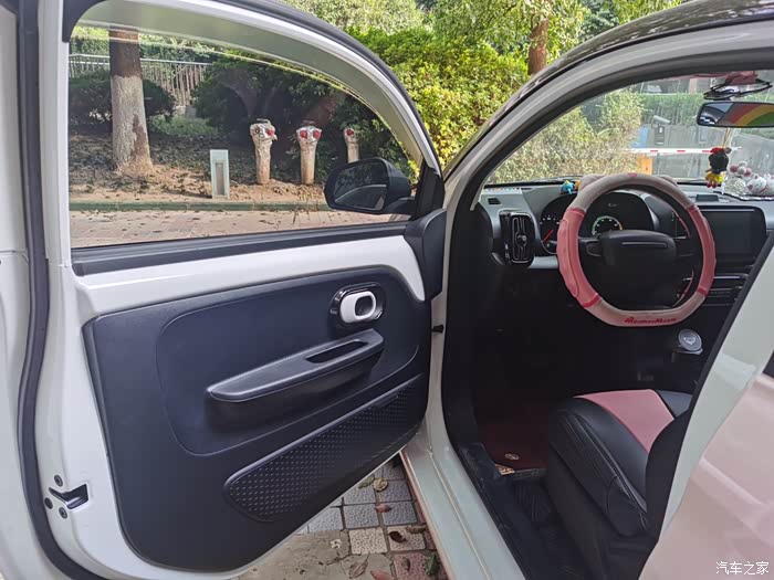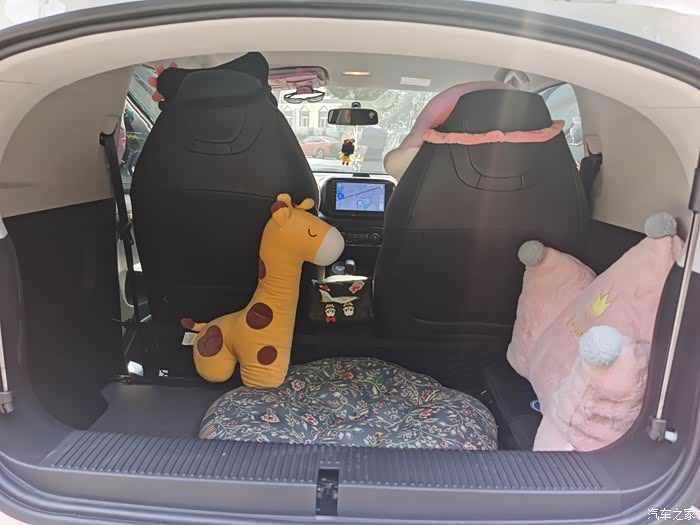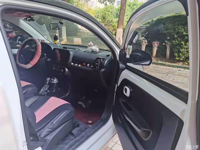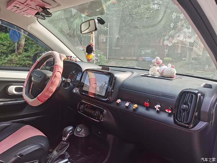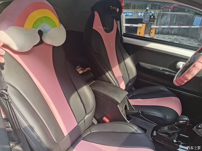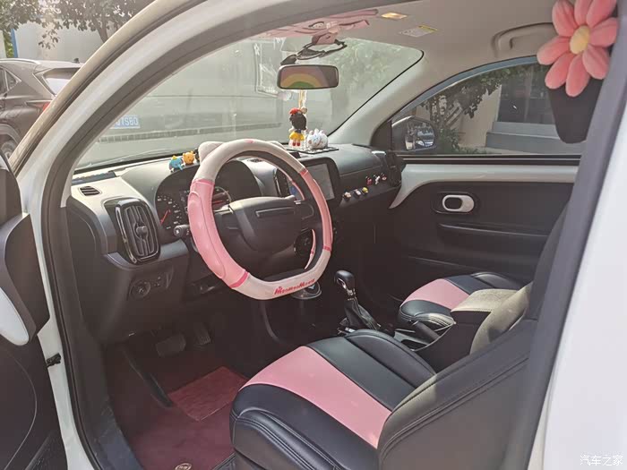 轮毂和前网都是熏黑了。内饰当然也是可爱系列,座椅套淘宝买到粉色系列,方向盘套也是,车前摆满了小玩意,哈哈。后备箱也是放了垫子靠枕,整个车子非常的温馨,我和女儿都是非常喜欢。