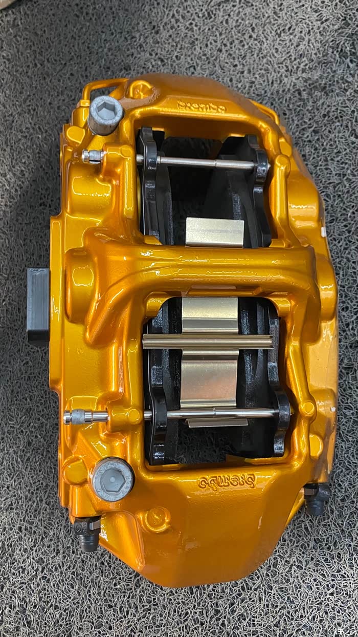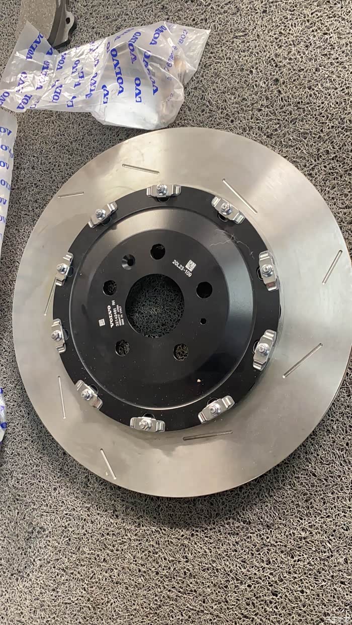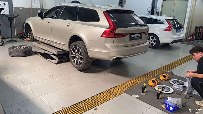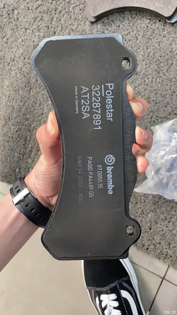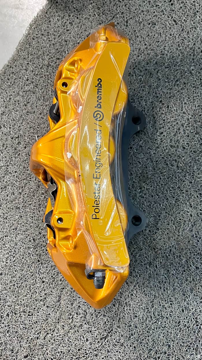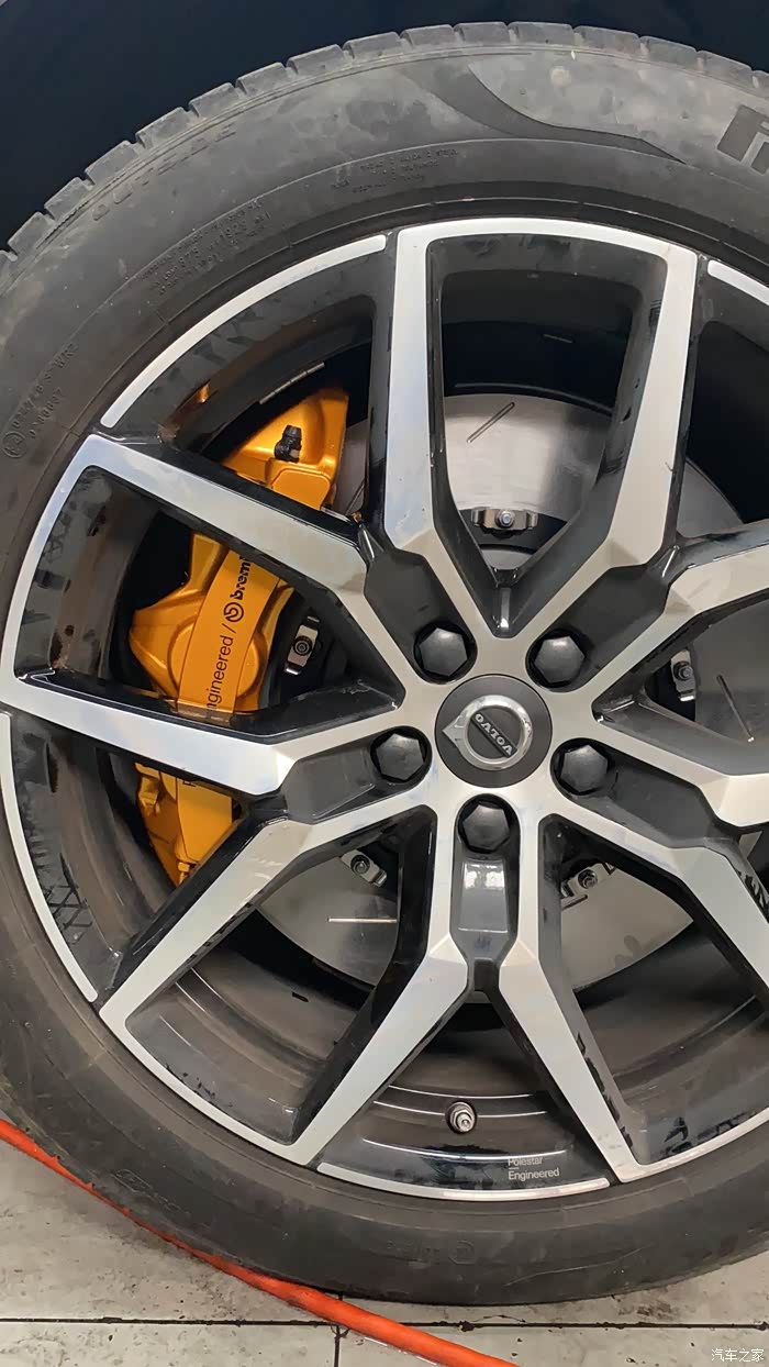 轮毂都准备好了所以自然刹车也要安排上,虽然说刹车距离的关键还是要看轮胎,但是由于V90cc原厂采用单活塞浮动卡钳的设计,使得刹车不是那么的线性,另外从视觉角度来说19寸轮毂+Brembo/PolestarEngineered的卡钳也会使得轮毂内部十分饱满