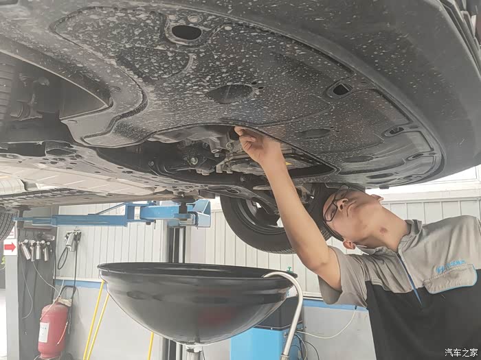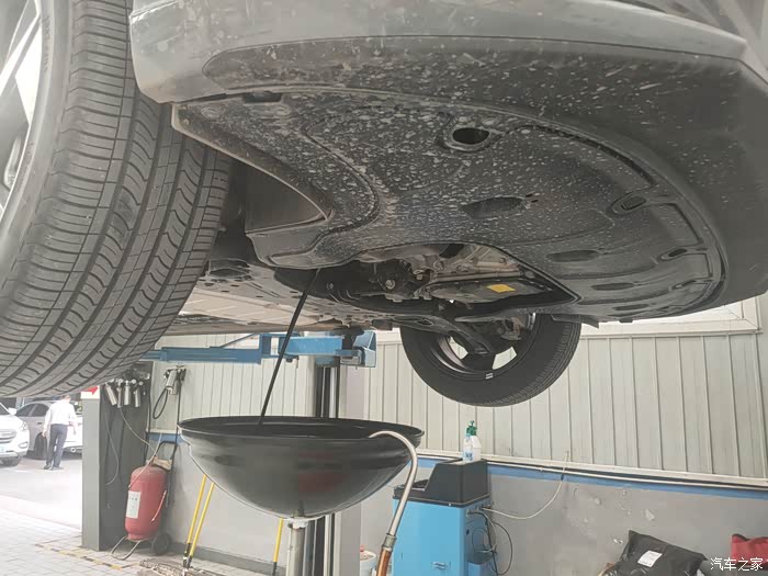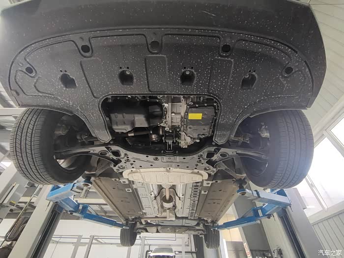 维修师傅把车开到工位,给发动机舱做了防护,就把车架到了架子上了。第一次看车的底盘,还挺整齐的,也没有什么明显的磕碰,我就放心了。
