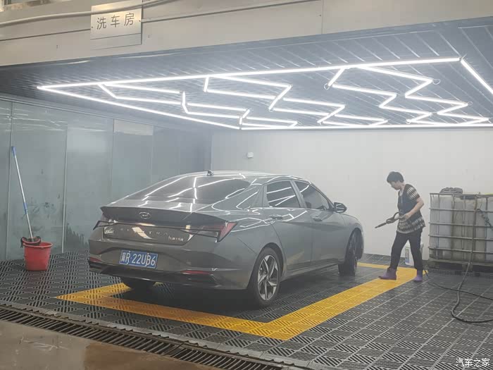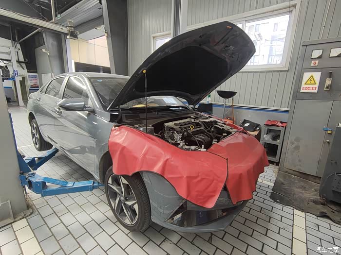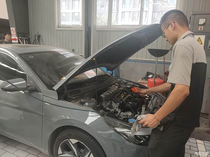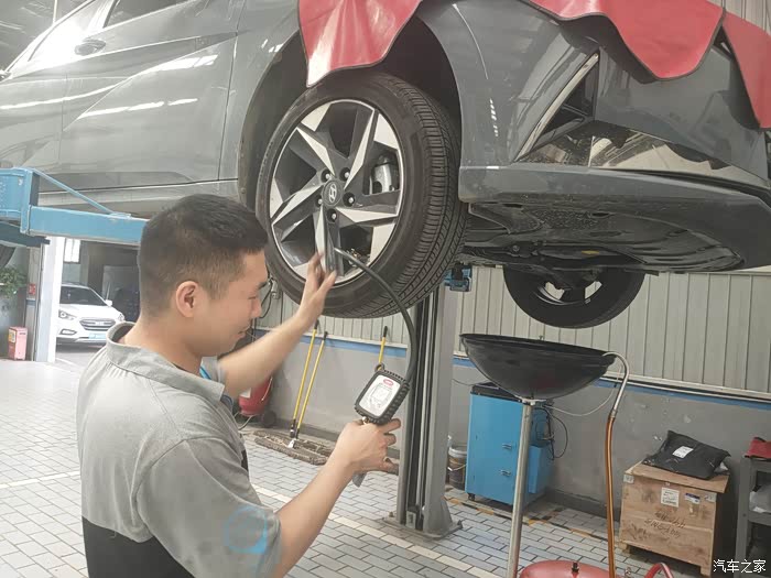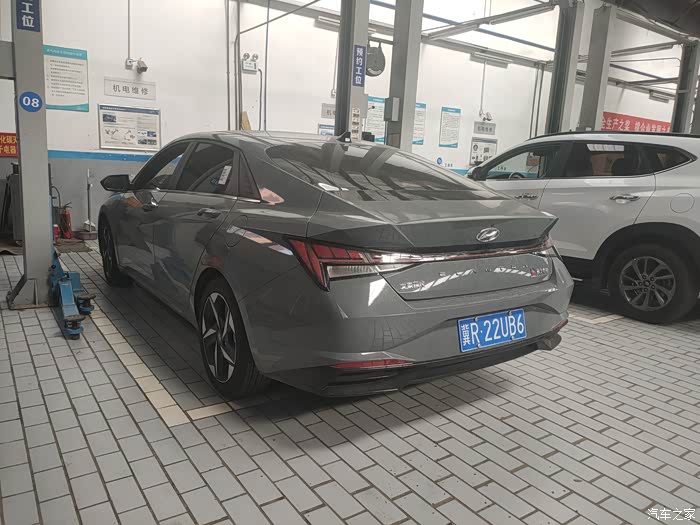 因为伊兰特是终身免费保养,不需要付费,工作人员给我在手机APP上核销了电子保养券,就让我到休息区等候。我还是挺好奇车是怎么保养的,就走到车间里参观了。