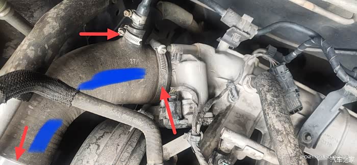 先用螺丝刀或套筒将图中红色箭头指的紧固卡箍拆下来,因为涂蓝色的胶管会影响拆卸,所以将它先拆下来,为后面操作腾出空间。拆胶管时方便操作可以将胶管另一端的黑色塑胶硬管的固定螺钉松开。
