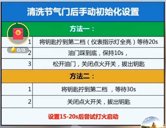 全部安装完毕,就要节气门翻板复位。因为清洗过程动过翻板,这个不复位会出现短期油耗增加,就是翻板怠速时开度变大造成的,下图有两种复位方法,第三种是拆电瓶负极一会儿,再接回去。不复位,开一段时间也会正常的,因为行车电脑会不断修整翻板开度。