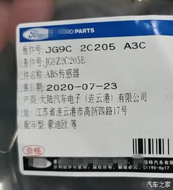 知道原因后上淘宝找ABS传感器,有3种配件。一、叫品牌的价格50元。二、原厂的商标大陆汽车电子(连云港)价格90元、三、原厂的福特商标价格140元。查了一下大陆电子是专门做传感器的,就买了90元的。有明白的车友麻烦告诉一下,两种原厂有什么实质性的区别?