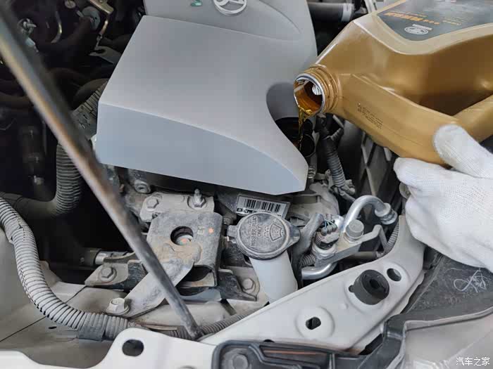 师傅正在给小威加新的机油。