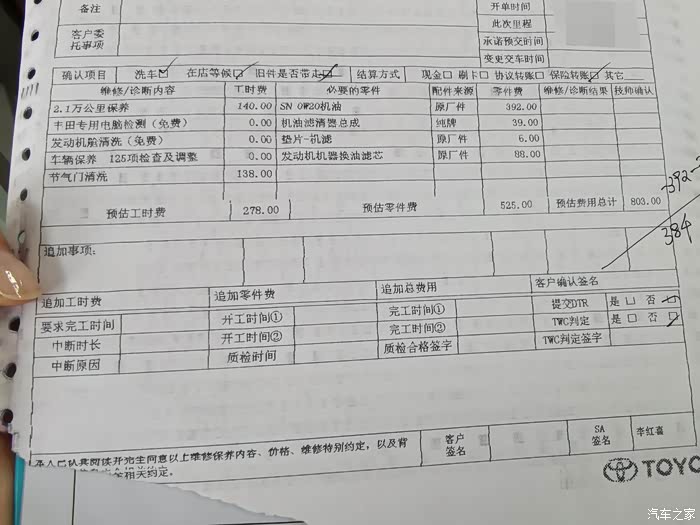 威驰保养的周期是一万公里一次或者是半年一次,像我们这样的经常跑车的就俺这个一万公里的一次来,我这一块丰田他们家做的还是挺不错的,保养的价格也不是很高几百块钱这样,车送到店里,工作人员快速接待,先把车来个全身基础检查,然后列出保养的清单待我确认之后就可以把车送到车间开始保养了