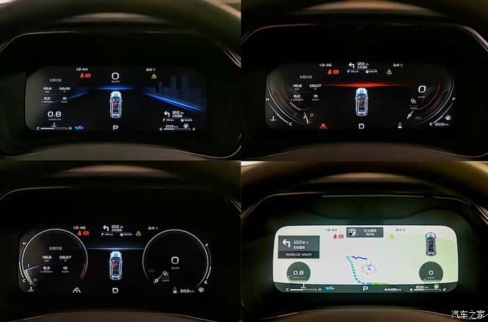 10.25英寸的全液晶仪表盘共有三种主题显示界面,每种转速表与时速表的样式完全不同。并且根据驾驶模式的切换,底色也会呈现不同的变化。最最重要的是,在中控屏设定好导航目的地后,可以通过三指飞屏,将全景地图从中控屏上引入进来。