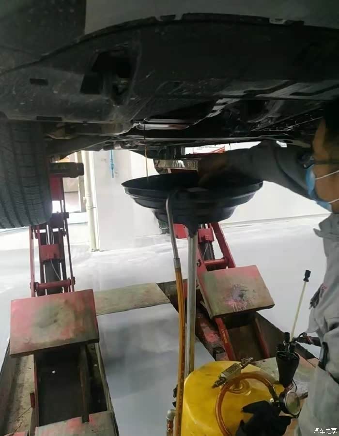 帅气的技师小哥哥正在给我的黑大个卸机油,一直加的全合成020标号机油,公里数长、燃油经济性不错,跑了差不多一万公里颜色还算新,不是那种黑乎乎的旧油。
