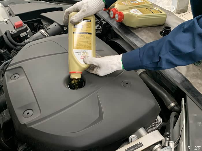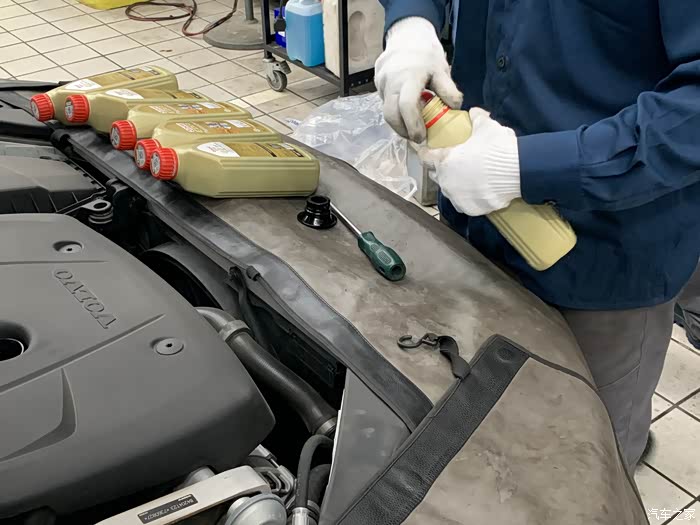 等废机油留下来后,就会加入新的机油,我每次的保养都是用的0w-20的机油原本以为应该没有多少,结果师傅拿了这么多瓶而且师傅的手法非常娴熟,有一个细节,每瓶机油倒完后,会用手接住瓶口,防止机油滴到发动机盖上。