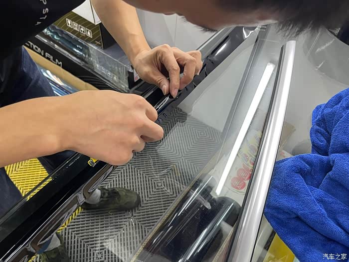 小哥后面两侧镀铬条熟练的拆下,再将主驾驶镀铬条拉起,方便后续贴膜,紧接着就是将需要贴膜的位置彻底的清洁,准备工作完成后,准备贴膜。