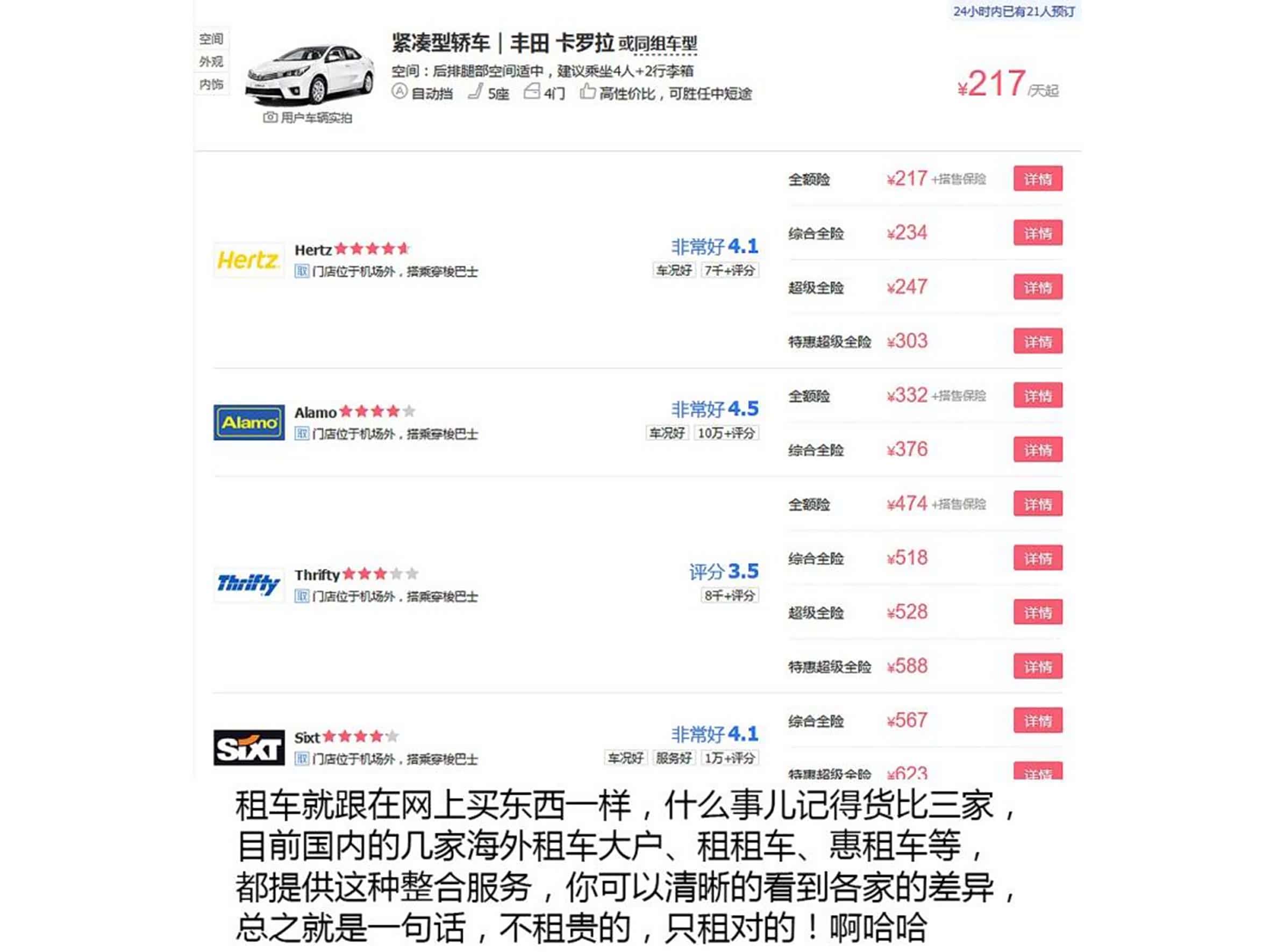 说实话,和国内租车的价格没差太多,但各家的服务却有着不小的差异,当然,目前国内的这些主流租车品牌,都已经将全球的主流租车公司整合到了一起,你可以像网购一样,清晰直观的对比它们在服务和细节上的差别,从而挑选到一台最划算的车子。