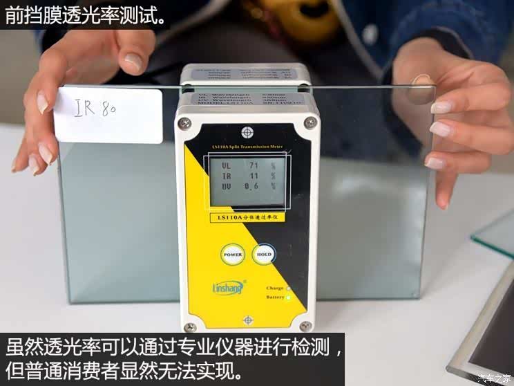 前挡膜除了隔热性能以外,最重要的就是透光率,因为司机需要通过前风挡来观察路况,所以前挡膜透光率的好坏会直接影响到我们的正常驾驶。其实国家对这项指标有硬性的标准,就是前风挡玻璃无论贴不贴膜,透光率都必须超过70%。