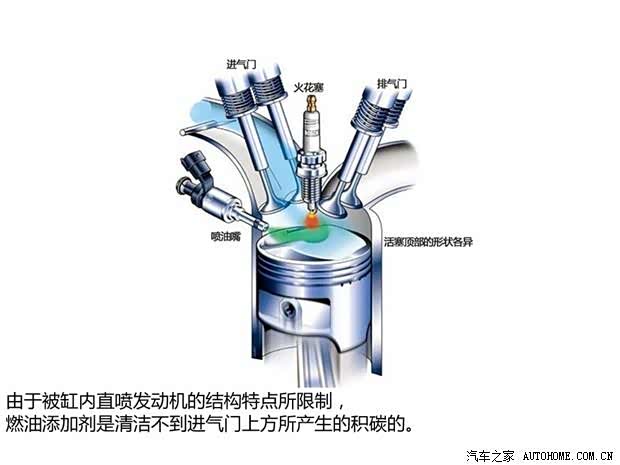 而由于有缸内直喷技术的发动机喷油嘴会直接把燃油喷入气缸内部,所以在使用燃油添加剂时发动机的进气门上方无法被清洁到,如果想清洁进气门上方的积碳,必须拆开发动机进行清洗;当燃油添加剂被喷入气缸内后,会溶解掉活塞顶部和燃烧室内的积碳,并使其燃烧后排出发动机。