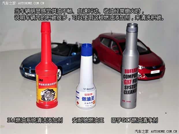 燃油添加剂中清洁积碳的主要成分是聚醚胺(PEA)、聚乙丁烯胺(PIBA)和聚胺(PBA),所以在挑选这类产品时要看清楚燃油添加剂中有没有这三种成分。不过在这里要提醒大家一下,一些积碳和结胶较多的车型,不适合使用这种添加剂,因为一旦清洁掉一大块污垢后,这些污垢会进入气缸,对气缸造成伤害;而对于可以使用这种添加剂的车型,在使用量上也不宜过多,否则可能会燃烧不充分,引起二次积碳的产生。清洁型燃油添加剂品牌举例:3M燃油系统清洁添加剂、安耐驰燃油王、巴孚G17燃油清净剂。