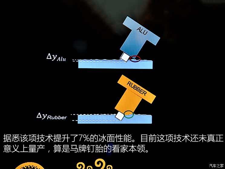 虽然对于全球市场来讲,钉胎的份额并不大,但马牌还是带来其最新的“钉子技术”——橡胶复合钉,即在原本的铝制钉子外再包裹一层特殊橡胶,当钉子嵌入雪/冰中时,橡胶依旧可以贴合雪/冰面,以此提升抓地,有点类似夏季胎中倒角的原理。