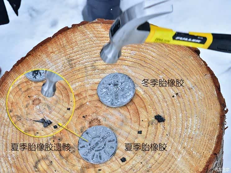 经过特别处理的夏季胎与冬季胎橡胶温度达到了-60℃左右,在这个温度下两者的硬度已经无限接近,用锤子砸下,夏季胎橡胶四散炸裂。虽然这项小测试温度有些极端,但可见夏季胎与冬季胎在耐低温特性上的差别。