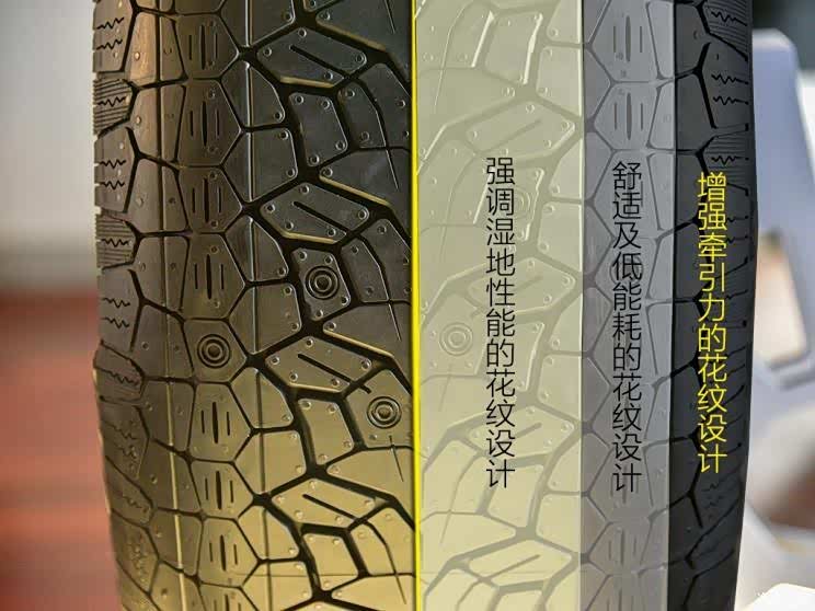 在节能模式下增大胎压、增加轮圈宽度,使得滚阻减小;在舒适模式下,轮圈保持不变,胎压减少,获得良好的滤振性能;湿地模式下,轮圈变窄,增加胎压,以此来提升单位面积内的压强,划破水膜;在牵引力模式下,胎压降低、轮圈变宽,增加接地面积。