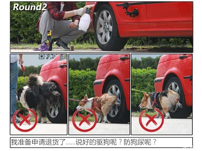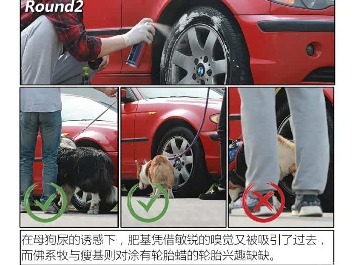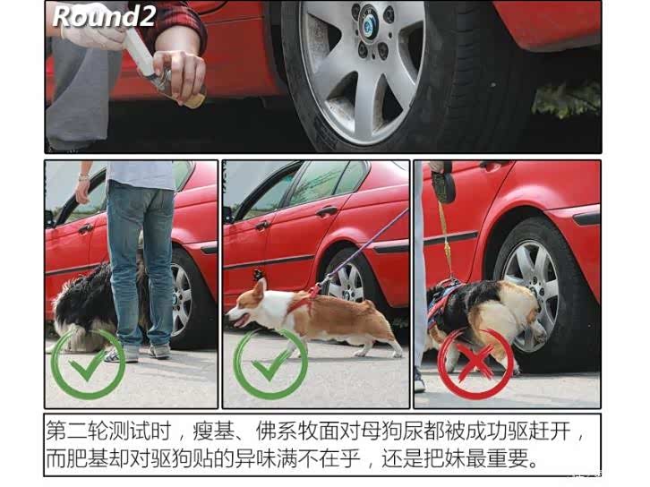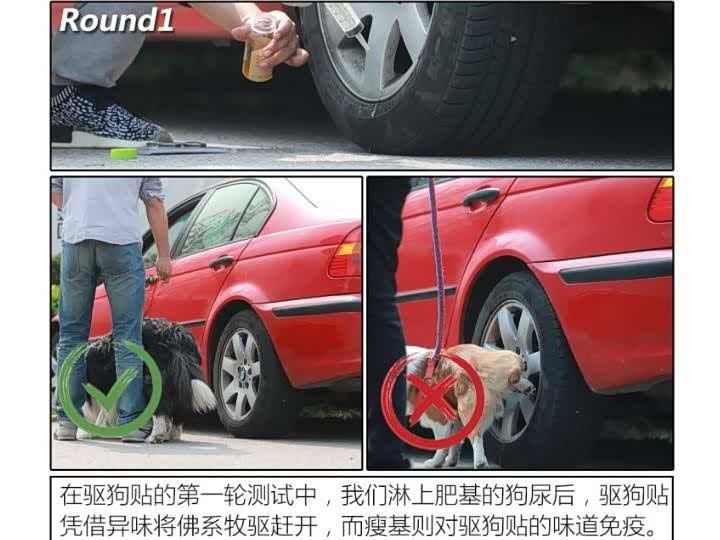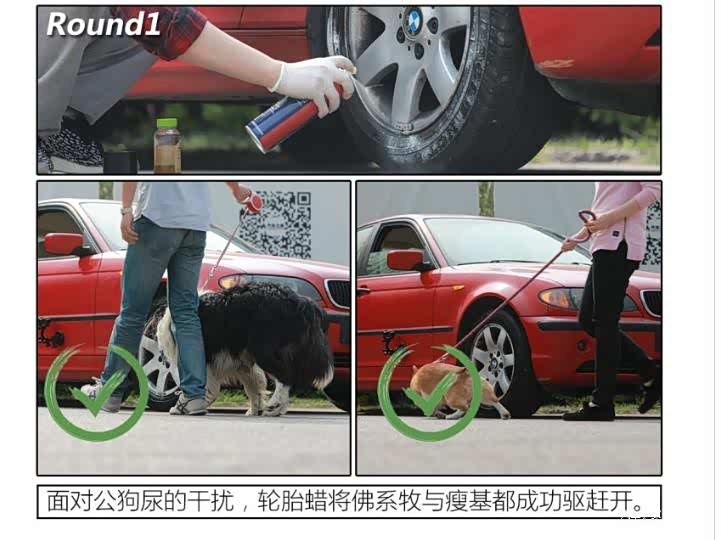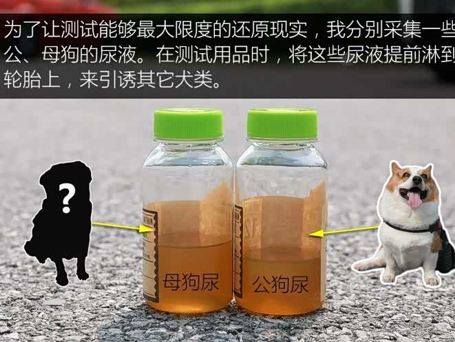 由于公、母狗排泄时姿势的不同,轮胎碰上公狗尿的几率要远远大于母狗尿。而母狗尿的诱惑力却远非公狗尿可比拟的。两轮测试,各位姑且可将第二轮当作对驱狗用品测试的加强版,旨在看看三款驱狗用品是否能做到万无一失。