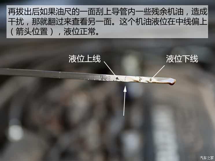 机油液位在机油尺测量区上下线之间就能保证发动机和相关零件的正常运转,这方面细节就不多说了。有些车主把机油尺拔出来就直接看油尺末端的刻度线,这是不正确的。在停车熄火几分钟后,虽然绝大部分机油已经回流到油底壳中,但机油尺上那些被曲轴搅动溅起的机油,依然会挂在机油尺上,这些机油经常和测量区的机油连在一起,导致误读的几率很大。