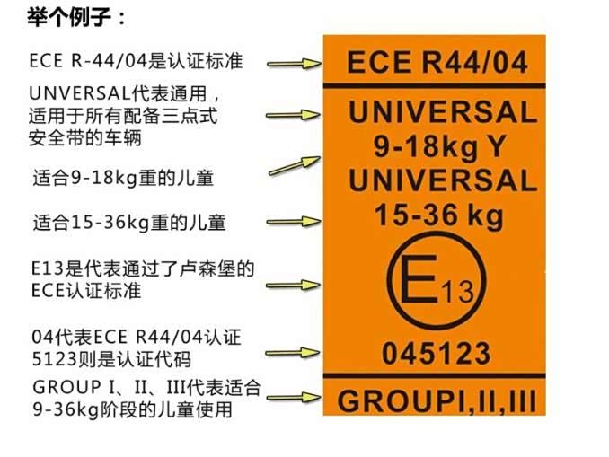 “ECE”这三个字母的全称是“联合国欧洲经济委员会汽车法规”,ECE认证就是符合这套法规中安全标准的认证。而“ECER-44/04”认证,则是欧洲经济委员会就儿童乘车防范系统的认证颁发的第44号法令,于1995年9月通过生效,它是专门针对儿童约束装置设立的认证,主要针对婴儿床、婴儿背带、儿童安全座椅这些产品,而车用儿童安全座椅也在此认证范围内。