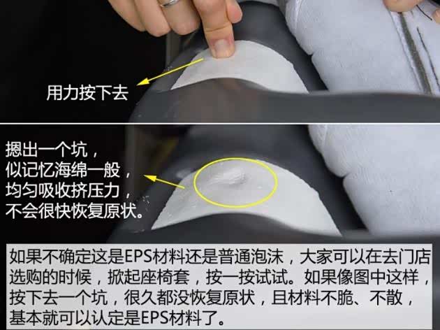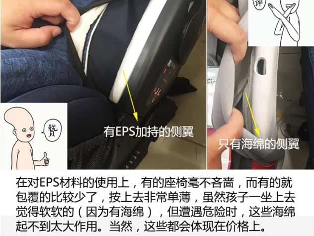 ●座椅用什么样的填充物好?像儿童座椅的面料,一般都是用的阻燃面料,符合检测标准才能上市,这种面料的特点是亲肤、透气、阻燃、耐磨,只要不是太次的座椅,用的面料都是大同小异的,摸上去手感也没什么差别。那么有的儿童安全座椅为啥那么贵呢?其实是贵在面料里面的填充物上了,一旦发生撞击,那些填充物才是真正能保护宝宝的东西。这也是去商场最容易被售货员忽悠的一点:“俺家产品用的材料多么多么牛”。那么售货员口中“非常牛”的材质,到底是个什么鬼?被广泛使用的EPS防震材料