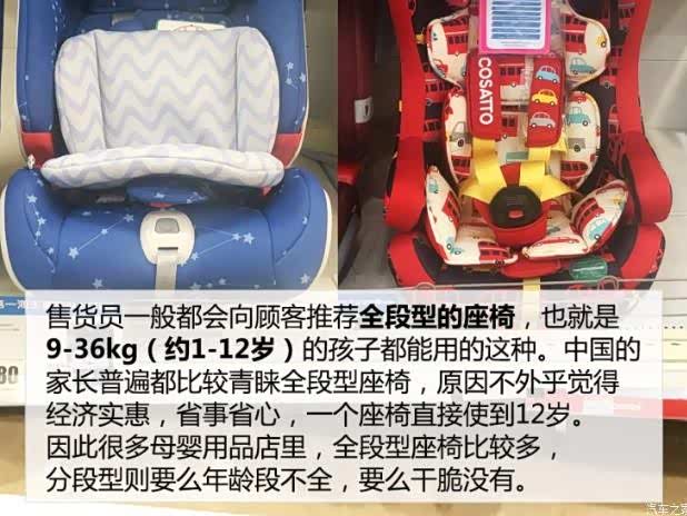 ●全段型座椅怎么样?既然商场里卖的最多的是这种全段型座椅,那它究竟好不好呢?到底是选它还是选分段型的座椅呢?针对这个问题,我也问了一下售货员,售货员自然是本着推销自家产品的原则,详细地给我展示了一下全段型座椅的优点:“首先,只需要买这一个座椅,就能覆盖9-36kg(约1-12岁)整个阶段,解决所有问题,省钱啊,省事儿啊!”从京东上看,最便宜的全段型座椅只有200多块钱,而最贵的上万元;从实体店来看,全段型座椅的价格为1600-3000元不等,和一个分段型座椅的价格几乎持平,因此在价格层面上,全段型座椅有一定的优势。“其次,宝宝坐这种全段型座椅感觉很舒服!”事实上,全段型座椅是靠拆装内垫、调节侧翼宽窄、调节头枕高低来适应不同年龄段的宝宝的。在这个过程中,很难保证适合每个年龄段孩子的身形。