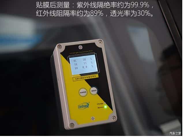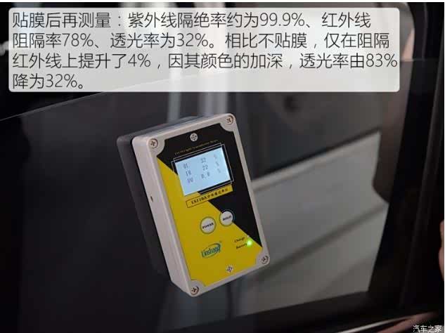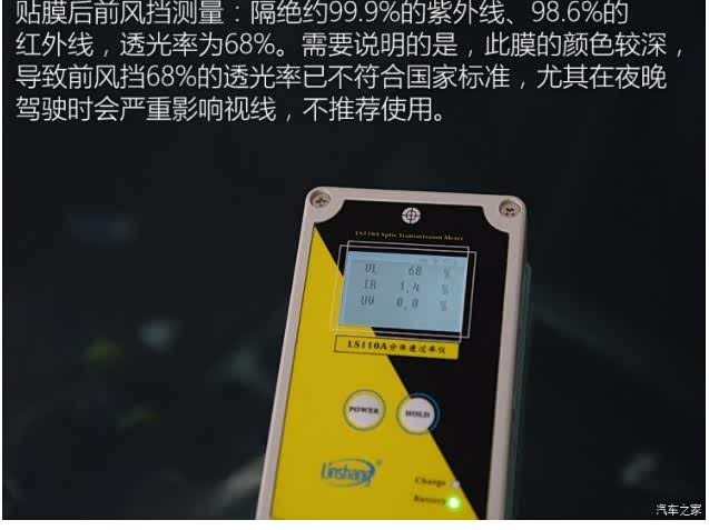 玻璃膜除了隔热性能以外,最重要的就是透光率,透光率的好坏会直接影响到我们观察外部环境。国家对这项指标有硬性的标准:前风挡玻璃无论贴膜与否,透光率都必须超过70%。上图中的玻璃膜透光率为67.9%,所以仅可以作为侧车窗贴膜使用。