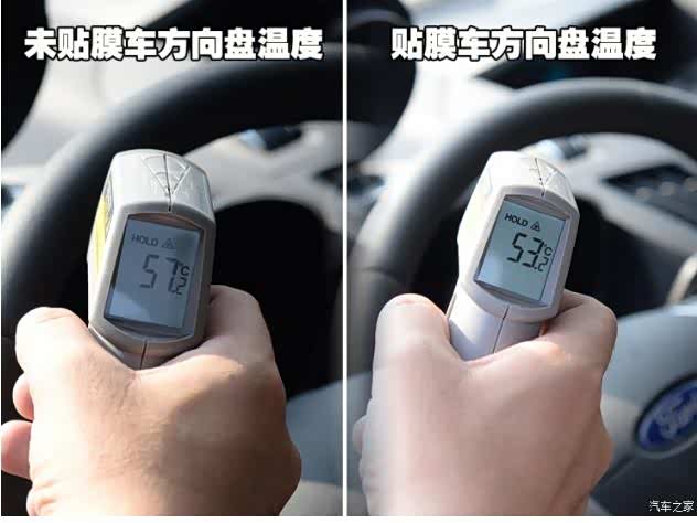 开启车门后迅速测量车辆方向盘及主驾驶皮座椅处温度,未贴膜车辆在方向盘和皮座椅温度上都高于贴膜车辆,且在皮座椅上温度差达到约9°C的。所以从这个实验可以看出,车窗膜在短时间内确实能起到对温度的部分阻隔作用。