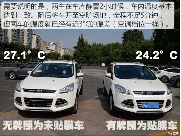 当天的气温为34°C,实验场地选在一个空旷、无遮挡的停车场内暴晒60分钟,以模拟短期停车后车内温度。将两车车头直面太阳光,车内起始温度分别为:未贴膜车27.1°C;贴膜车24.2°C。