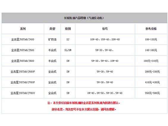 长城机油的产品线覆盖的比较全面,从矿物机油、半合成型机油到更为高级的全合成型机油都有涉及,并且分为不同的产品序列,编辑在了解了长城机油的市场销售情况及产品关注度后,选择以目前在售的长城“金吉星JUSTAR”系列机油(下文简称金吉星)为例为大家进行重点介绍,这款机油是目前长城机油的主销产品,像早期的福星、SE、SF系列机油由于技术含量已经不符合当今家用车对油品的要求,已经退出了主力市场,只在一些三线城市及农村才能见到了。另外,在参考价格方面,由于长城机油官方主推的销售点是石化加油站及天猫旗舰店,而加油站中售卖的多为中低端型号,像比较高端的金吉星J700系列则很少供货,所以文中的参考价部分将以天猫旗舰店为参考对象。