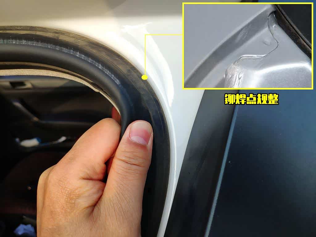 车身生产时,在门框部位都会采用机器人的铆焊进行连接。如果门框存在事故撞击后的修复,那么这些焊接点势必没有出厂时的那样规整。打开车门密封条即可轻易观察。